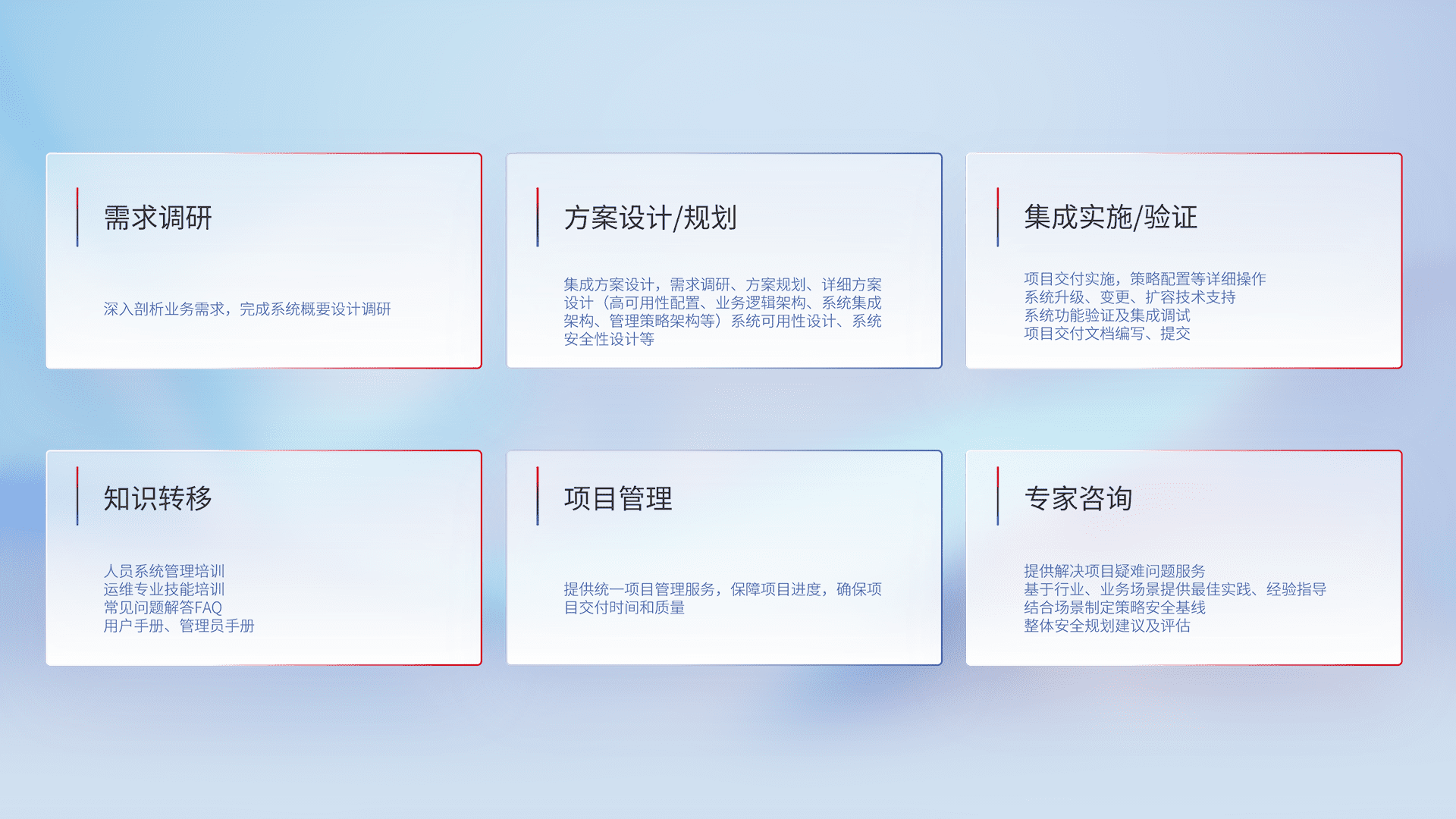 针对客户行业特性,,将宏观的安全战略和需求,,,,通过专业的交付服务,,,实现项目落地,,,为客户提供标准规范的集成交付服务。。。。