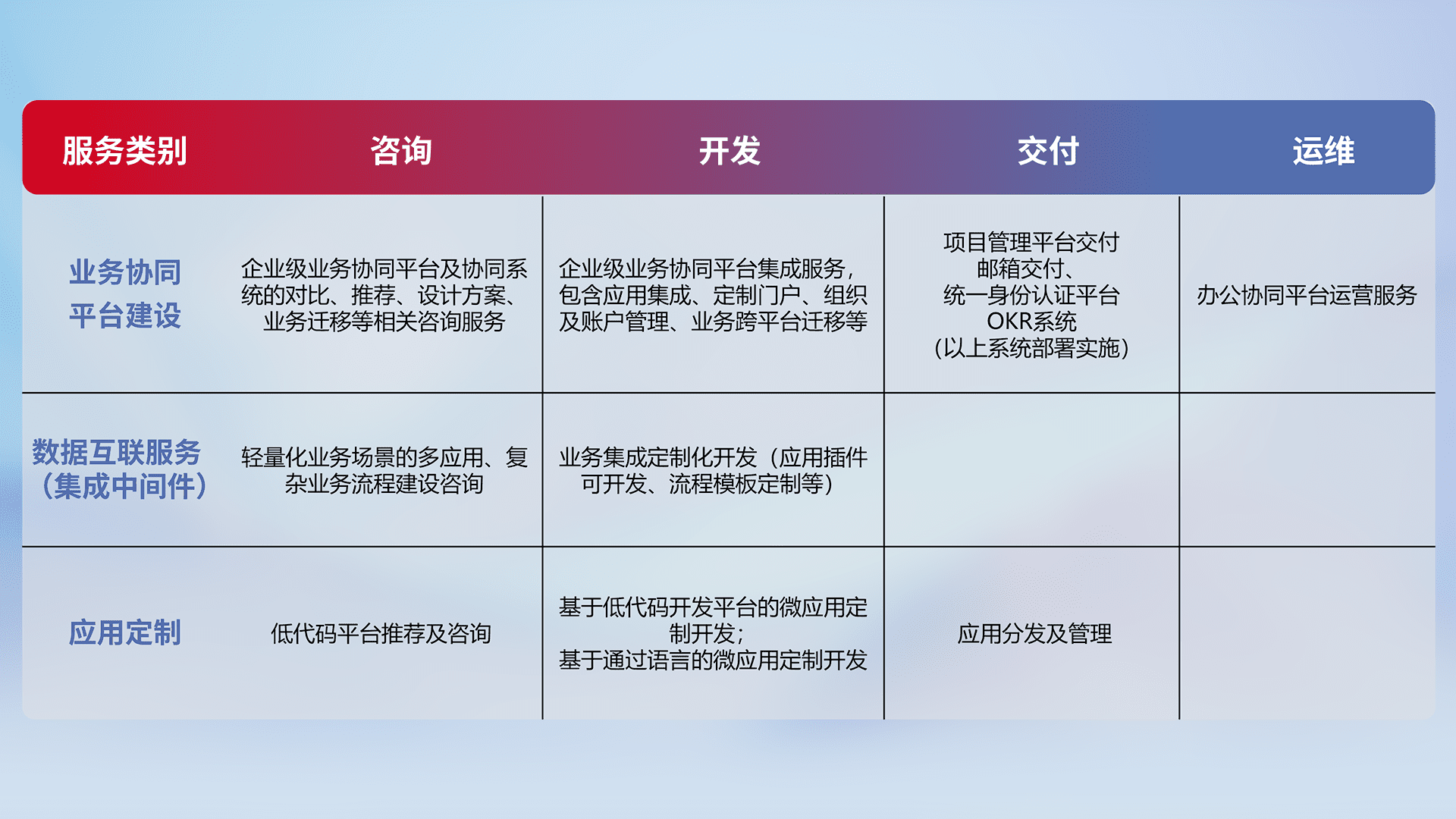 针对钉钉、、、企微、、、、IDaas等平台级产品提供产品的规划、、方案、、、、交付、、、、定制化开发等服务,,,实现如统一协同办公、、、、智能客户服务、、、、混合会议管理、、、智能数据查询、、等业务场景,,实现数字化转型。。。